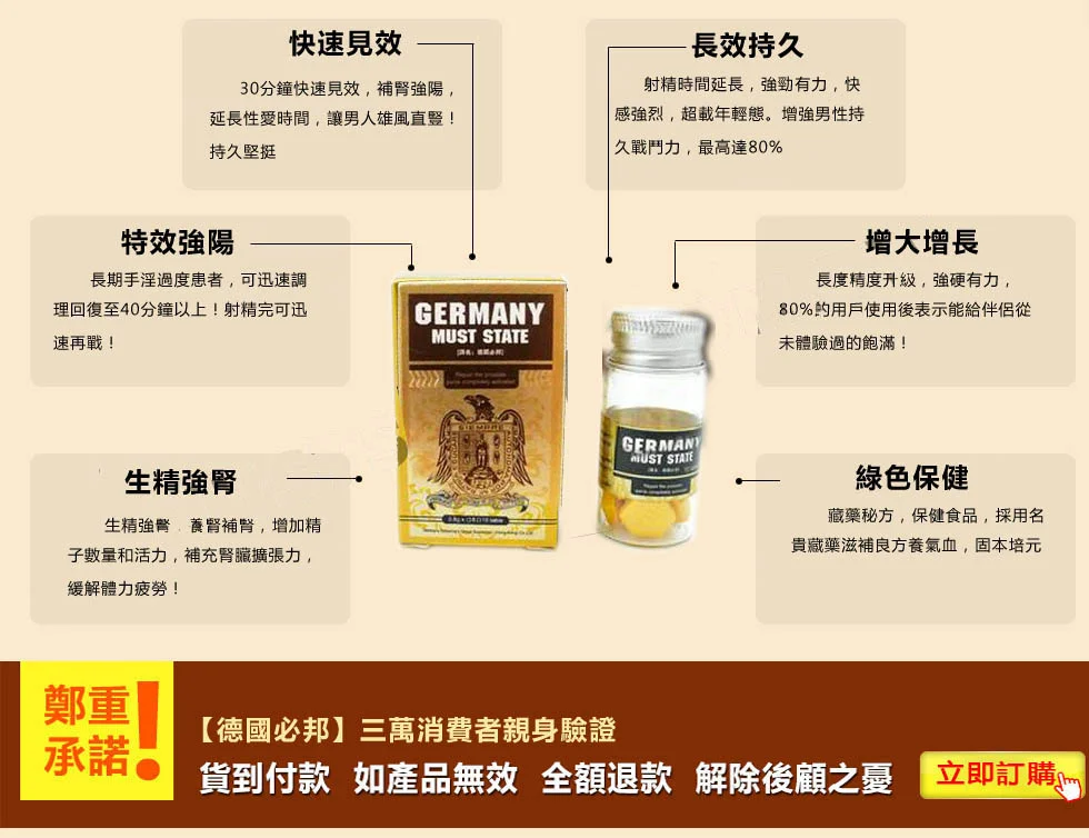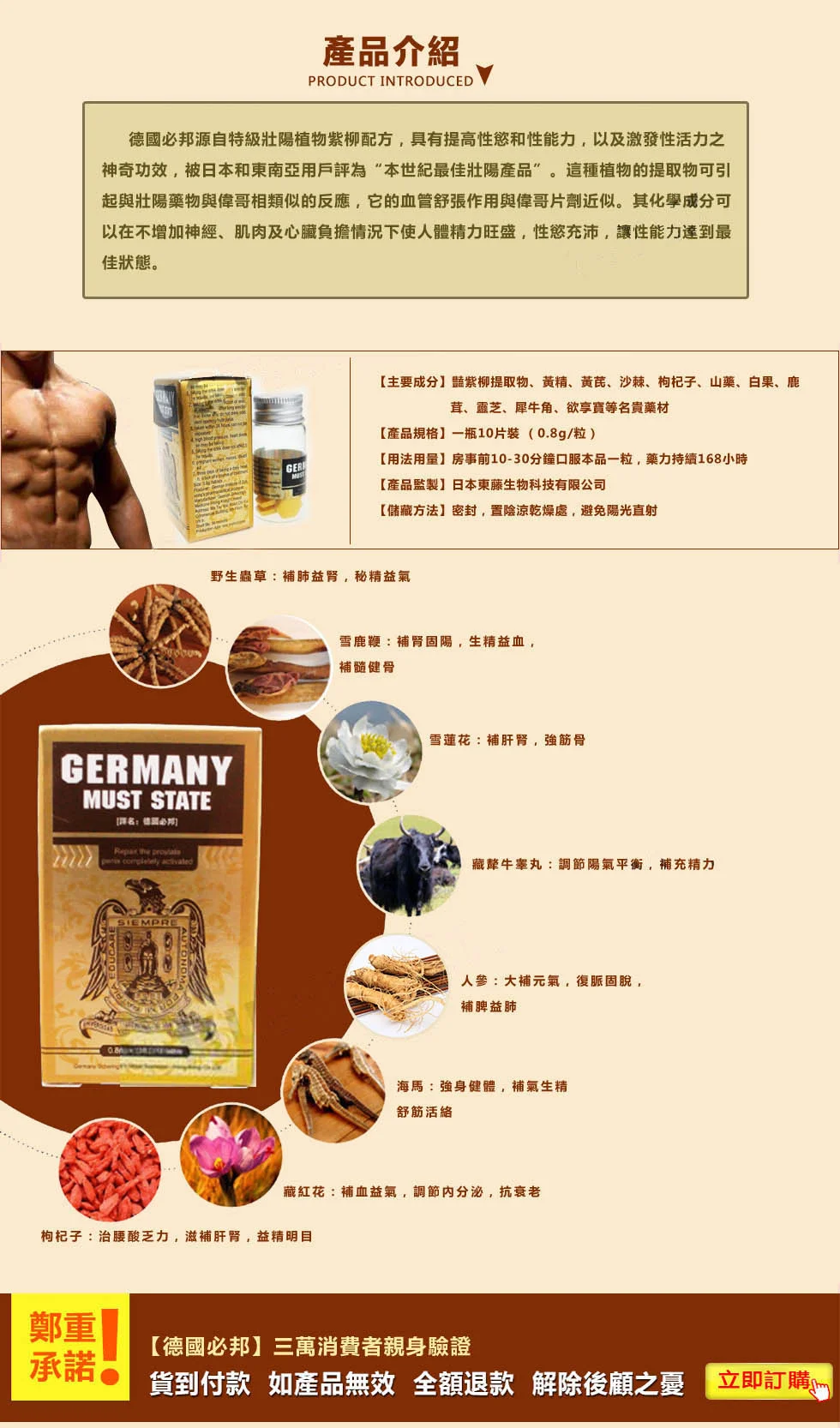 • 持續使用德國必邦,可促進男性健康,強化體質,減少由壓力、疲勞和年齡帶來的性功能問題,全面提升您的生活品質。