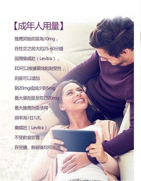 • 每次性行為前服用1顆樂威壯 Levitra 20mg,建議在性行為前約30分鐘服用,並確保有性刺激以達到最佳效果。