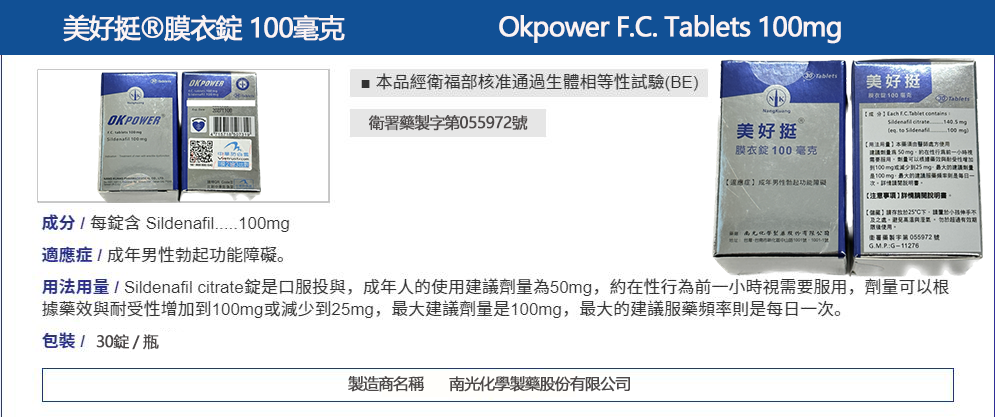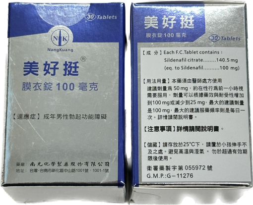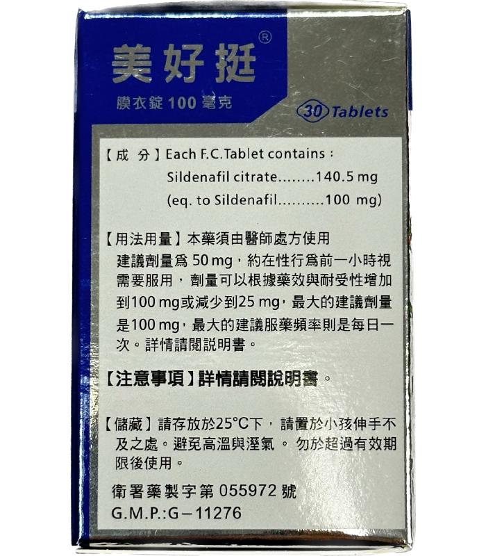 - 主要成分: 每片含有 100mg Sildenafil,該成分為治療勃起功能障礙的標準藥物,能有效幫助男性實現堅挺勃起。