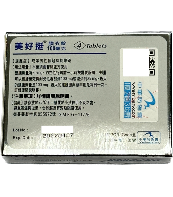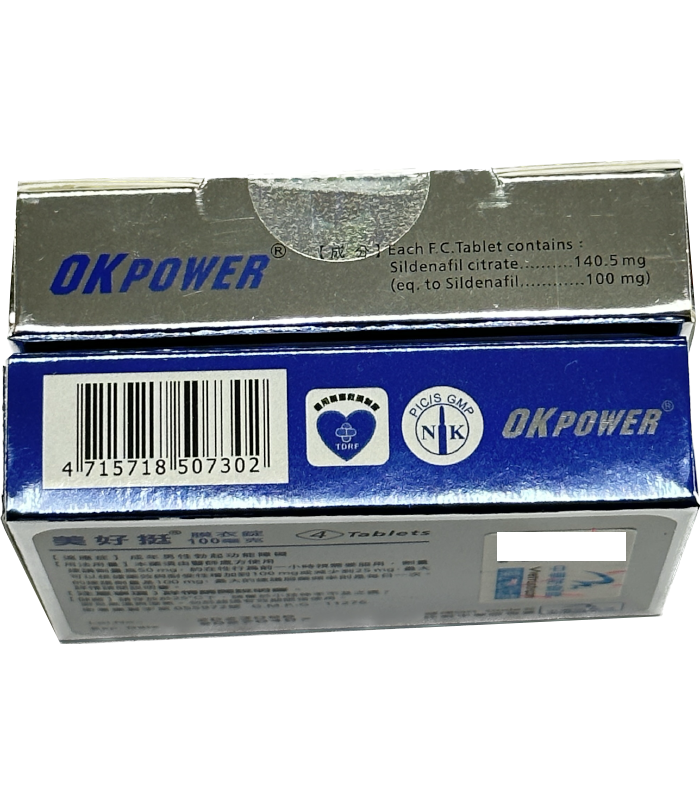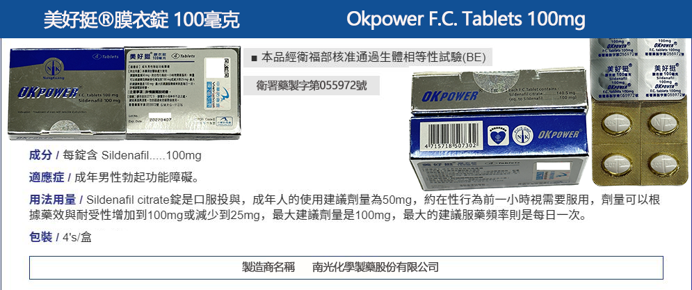 - 每盒含 4 錠 美好挺膜衣錠 OKPOWER,每錠含 100mg Sildenafil