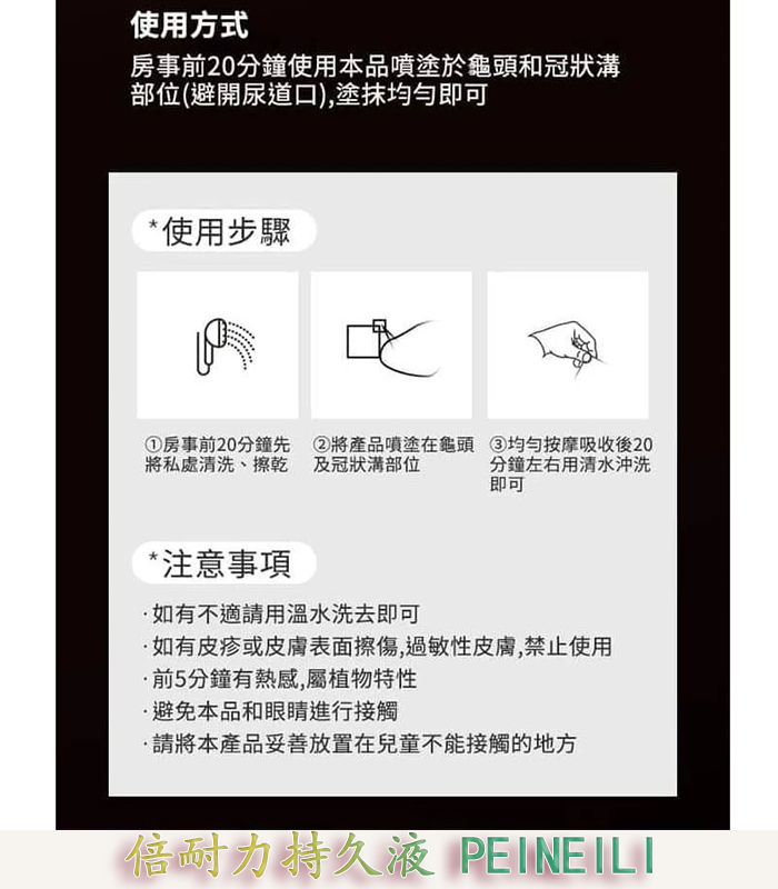 - 使用部位:噴於龜頭和冠狀溝部位。