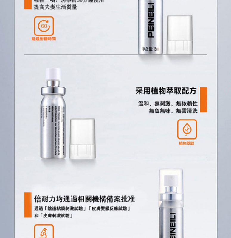 倍耐力 PEINEILI 持久液屬於成人用品類,專為男性設計,有效緩解不硬、時間短、不舉等現象。這款延時噴劑採用現代生物科技和純天然中草藥配方精制而成,主要成分包括蛇床子提取物、丁香提取物、紫霄花提取物、桂皮提取物等,能有效防止早泄,改善體質,增強免疫功能。