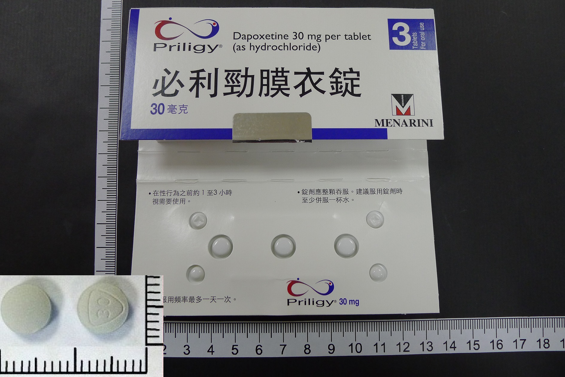 每盒包含 3 錠 Priligy 30mg 膜衣錠,每錠含有 30mg 的 Dapoxetine(達泊西汀)作為主要成分。這款藥物經過德國生產與嚴格的品質檢測,確保每顆藥錠的安全性與有效性。每錠的劑量專為一次性使用設計,以滿足個體的治療需求。