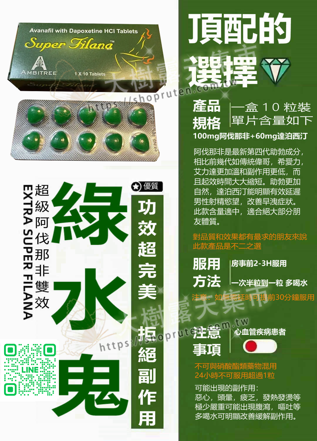 - 助勃效果:Super Filana 綠水鬼的主要成分阿伐那非是一種新型的 PDE-5 抑制劑,作用於血管擴張,促進陰莖內的血流增加,迅速改善勃起困難,達到更強硬的勃起效果。