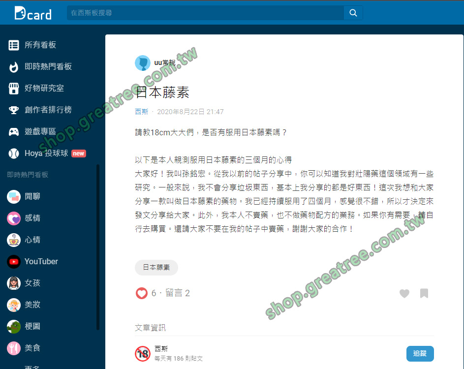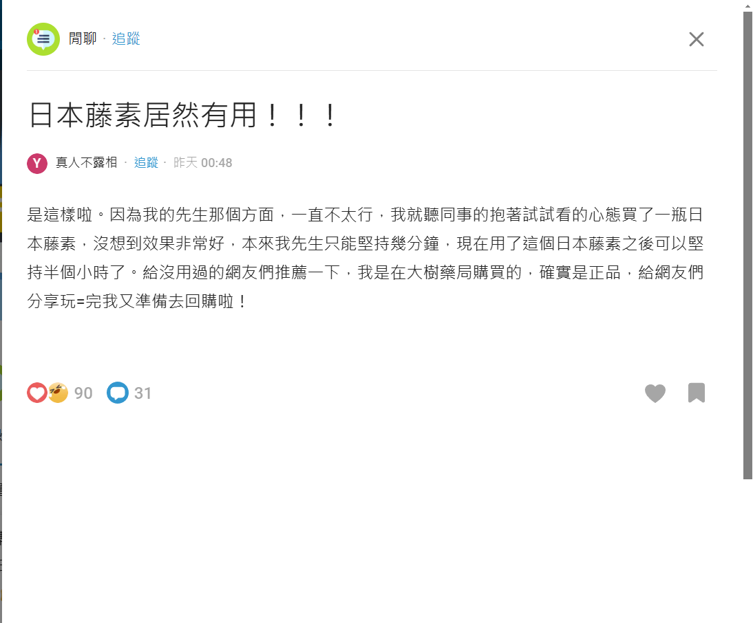 若你正在尋找一款天然且持續性效果的男性壯陽補品,日本藤素無疑是一個值得嘗試的選擇。透過Dcard等論壇的真實分享可發現:效果因人而異,但持之以恆大多能看到成效。